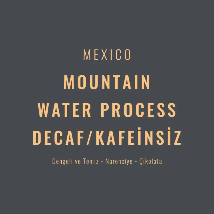 Meksika'nın en yüksek dağlarından elde edilen dağ sularının kullanılarak kafeinsizleştirme işlemi yapılan bu kahve temiz ve dengeli karakteri ile beğenimizi kazandı. Yeşil kahve çekirdekleri, kafeini çıkarmak için suya batırılır. Dağ suyu kafeinin çıkarılması sırasında kahvenin orijinal tat bileşenlerini korur. Elde edilen kahve% 99,9 kafeinsizdir. İşlem bittikten sonra çekirdek kurutulur ve paketlenir.