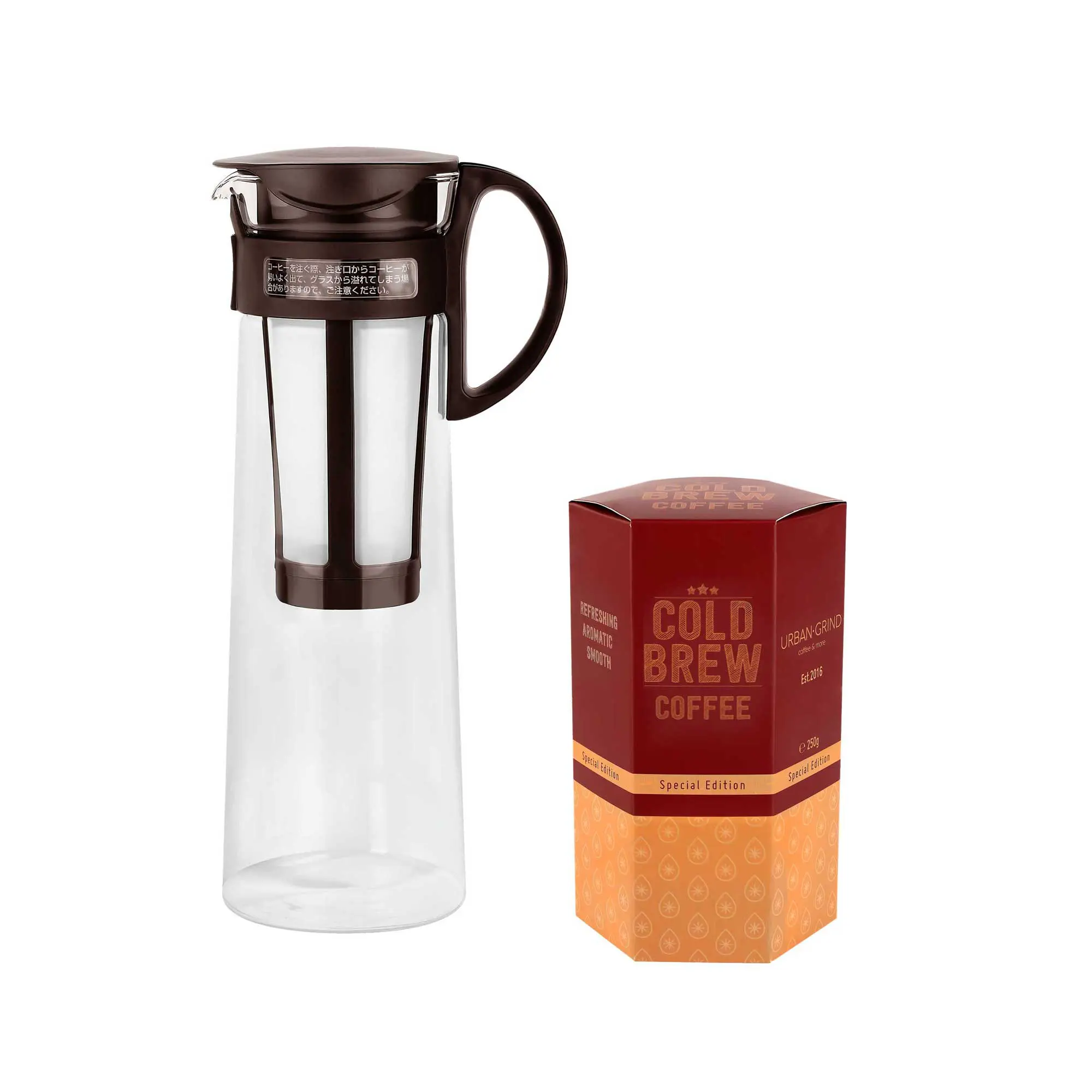 Bu set soğuk kahve demlemeye başlamak ve sevdiklerinize hediye etmek için hazırlanmıştır. Set içerisinde 1 adet Hario Mizudashi Soğuk Demleme Ekipmanı, 1 adet 250 gram Urban Grind Cold Brew kahve yer almaktadır. Görsellerdeki kupa ve diğer aksesuarlar sete dahil değildir. Japon marka Hario kahveseverlere muhteşem bir soğuk kahve demleyicisi sunuyor. Bu ürün, kahve çekirdekleri ve soğuk suyu bir arada tutarak demlemenizi sağlayacak filtre ve cam karaftan oluşuyor. Tek yapmanız gereken filtreye iri öğütülmüş kahve, sürahiye ise soğuk su koyup yaklaşık 8 saat beklemek. Bu pratik ve rahat kullanımlı ürün soğuk kahve demlemenin en kolay yolu. Urban Grind yılın bu en sıcak zamanında içinizi ferahlatacak Cold Brew Coffee' yi sizler için harmanladı. Yaz ayları için özel olarak üretilen Cold Brew Coffee, Güney Amerika çekirdeklerinin çikolata, karamel ve ceviz notalarına sahiptir. Bu notalar aromatik ve canlandırıcı bir soğuk kahve demlemenizi sağlar. Başta Mizudashi olmak üzere hem cold brew hem de cold drip ekipmanlarınızı kullanarak bu kahve ile en güzel soğuk kahveleri demleyebilirsiniz. Yazın bu en sıcak günlerine girerken sevdiklerinizle keyifli anlarınıza eşlik edebilecek Urban Grind Cold Brew Coffee sınırlı sayıda üretilmiştir.