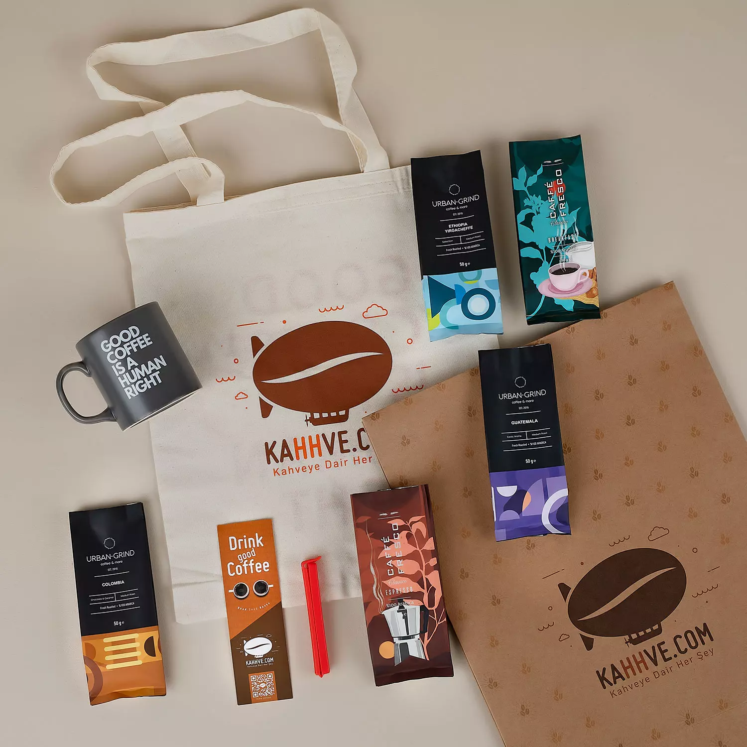 KahhveCom'dan kahvesever sevdikleriniz için çok güzel bir hediye fikri. Bu set içerisinde Beş farklı kahveden oluşan Kahhve Tadım Seti, KahhveCom Organik Bez Çanta , Kitap Ayracı , KahhveCom Seramik Kupa , ve Kahve Paketi Klipsi bulunmaktadır.